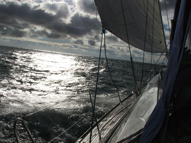 m'explique que nous nous situons sur " le rail " c'est-à-dire sur le passage de nombreux cargos, donc la vigilance s'impose. La nuit s'illumine des feux des bateaux il est vrai qu'il y en beaucoup, ma seule crainte serait de devoir changer de cap, je n'ai pas du tout envie d'enlever le pilote et de prendre la barre en pleine nuit pour faire une manuvre d'évitement, mais bon cela ne se produira pas. C'est assez impressionnant car la nuit l'évaluation des distances est complètement faussée. Guy a pris la relève et ensuite Xavier, cette nuit là le vent était compris entre 20 et 25 nuds, l'idéal, avec une vitesse moyenne d'avancement de 6 nuds.