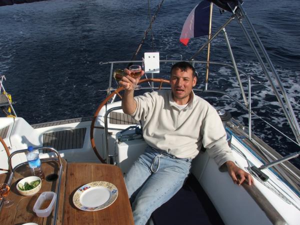 Quant à Serge, il a très mal au pied depuis plusieurs jours, et peut à peine le poser par terre, aujourd'hui il s'est installé sur la jupe arrière de Hina (sanglé bien entendu), et à laissé pendre son pied dans l'eau, histoire d'effectuer une sorte de drainage, il a également bu son verre de rosé à cet endroit.