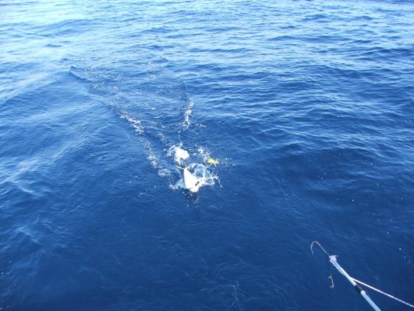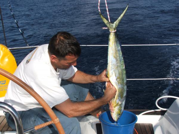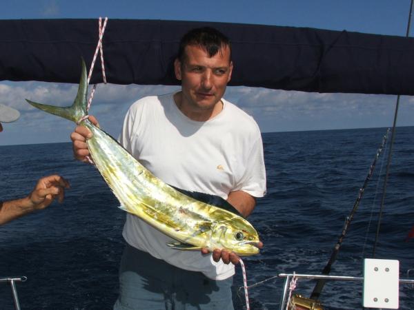 Il s'agit d'une superbe Dorade Coryphène (France), encore appelé Dolphin (GB/USA) ou Mauï Mauï (locaux), on ne souhaite qu'une seule chose, surtout, pourvu qu'elle ne se décroche pas, Serge la ramène petit à petit et Xavier est déjà sur la jupe arrière pour l'attraper avec une sorte de pic à glace style " Basic Instinct "