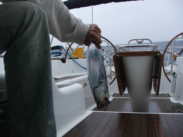 Vers 17H00 Xav attrape une petite bonite, nous la mettons au congel pour pouvoir la manger en tartare avec citron vert, huile d'olive, échalotes et aneth, le fait de la congeler nous évite tous risques, surtout lorsque le poisson est mangé cru
