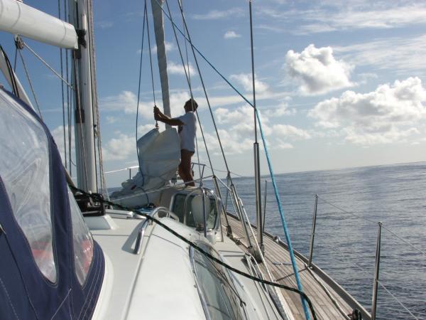 Nous avons tourné toute la nuit au moteur puisque il n'y a toujours pas de vent. Puis vers 14 heures, 15 nuds de vent, nous avons navigué avec la grande voile et le génois en ciseaux. Nous déjeunons du canard de barbarie mijoté aux oignons accompagné de pattes.