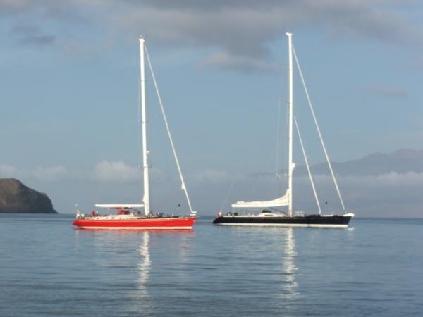 Le ciel est bleu, on aperçoit au loin le Swan rouge et à côté de lui un monocoque encore plus grand, un 80 pieds.