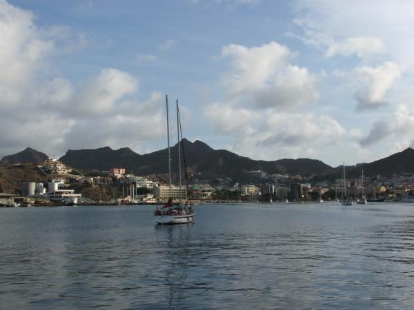 Je me mets sur le canal 16 de la VHF en demandant à plusieurs reprises de l'aide en anglais et en français pour rentrer dans le port de Mindello, car la baie à l'air très profonde. Personne ne me répond, je fais la même chose sur le canal 9, cela va bien durer 30 minutes, lorsque d'un seul coup sur le canal 9 un homme parlant français s'adresse à moi pour nous indiquer où il faut passer, soulagement, puis il se présente, il s'agit de français au mouillage à Mindello sur un Swan de 64 pieds, ils nous guiderons jusqu'à notre arrivée, puis feront clignoter leur feux pour se situer, apparemment ici, on ne peut rester qu'au mouillage. Le port est assez profond dans les terres et bien à l'abri. Nous nous rapprochons d'eux quand surgit sur bâbord une petite annexe pneumatique, il veut nous guider pour notre emplacement, c'est un Cap Verdien nommé Paul.