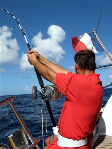 Jeff qui n'a jamais pêché à la traîne se précipite sur le fil, voulant remonter le poisson à la main, Xav l'en empêche mais Jeff reste septique en regardant Xavier s'installer, mettre le baudrier, et commencer à mouliner, il est encore plus ahurie lorsqu'il constate que le poisson est à bord au bout de 10 minutes à peine !!!