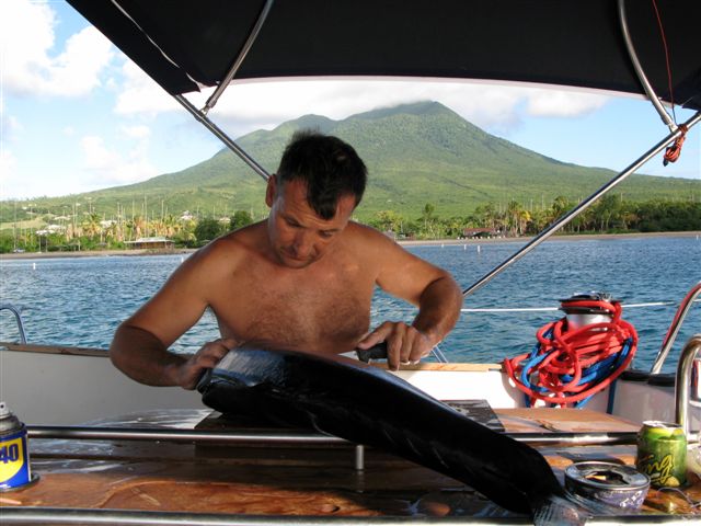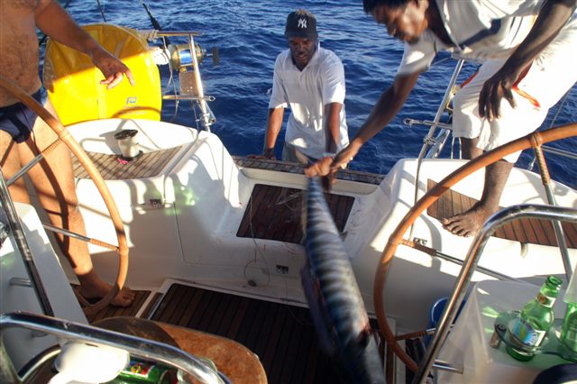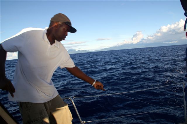 Nous décidons de naviguer du côté atlantique, la mer est bien formée avec des creux d'environ 2 mètres. Nous longeons St Kitts, et tout à coup le moulinet retentit, il est vrai que de ce côté, les fonds et tombants sont propices pour la pêche aux gros.