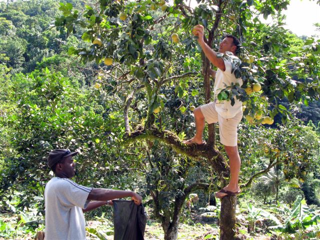 Xav entreprend de cueillir pamplemouses et oranges directement dans les arbres tandis que Jeff lui tend un sac ... bien plus sympa de cette façon.