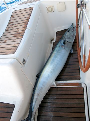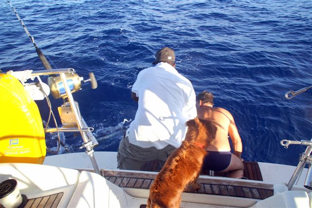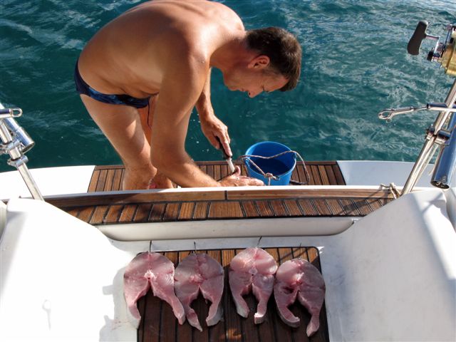 Jeff en conserve un vivant, lui plante un hameçon, et le remet à l'eau avec 70 mètres d'un fil énorme relié à un gros bidon servant de flotteur. Pendant ce temps nous continuons à tourner autour des bouées avec le voilier.