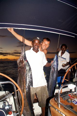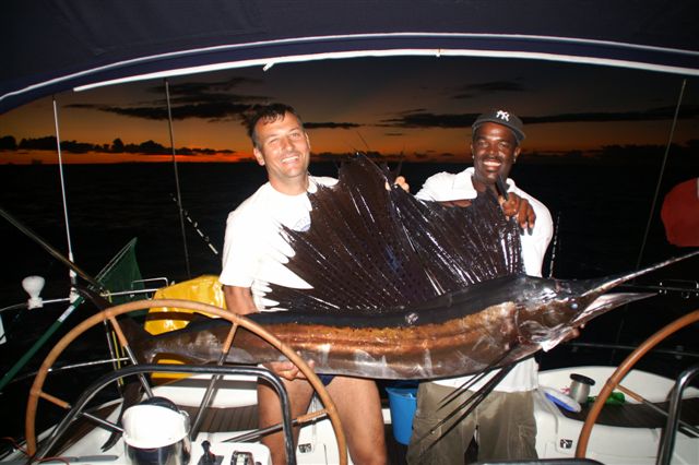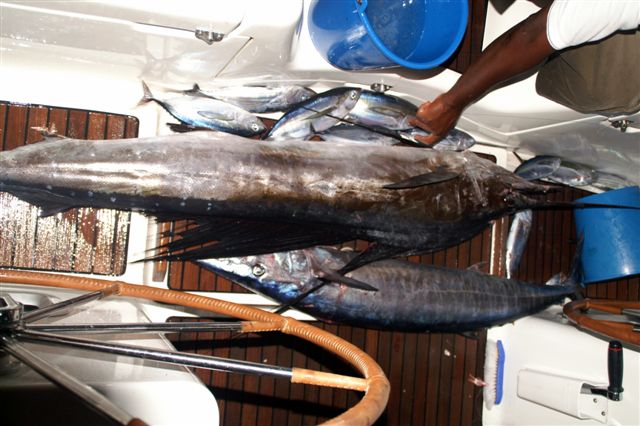 Nous sommes ravis, il s'agit d'un Sailfish (poisson voilier). Ce poisson est très combattif, et lorsque Jeff l'a gaffé, Dédé l'a mattraqué par trois reprises tant il se débattait et essayait de perforer tous ceux qui se trouvaient sur son passage ...