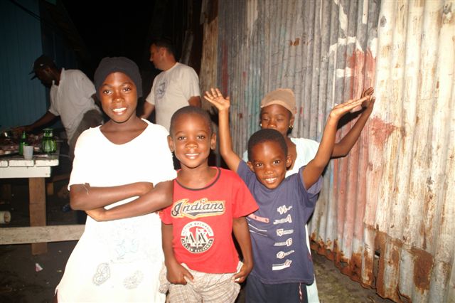 Les enfants sont très curieux et souriants pendant que Jeff s'active, ils sont contents lorsque je les photographie, à droite en bleu, le fils à Jeff.