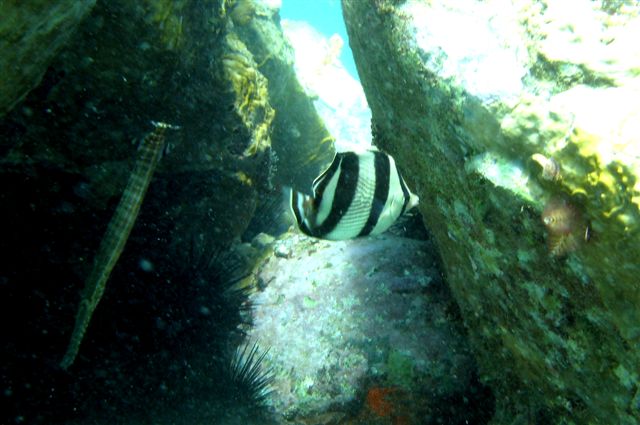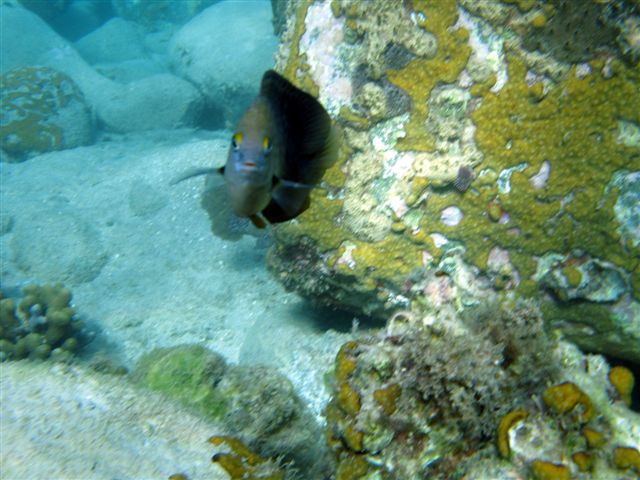 La variété de petits poissons, ci-dessous, à peine 5 cm, est très territoriale et courageux, ils m'attaquent toujours lorsque je m'approche d'eux, jusqu'à toucher mon masque, donc dur de les prendre en photo !!! ...