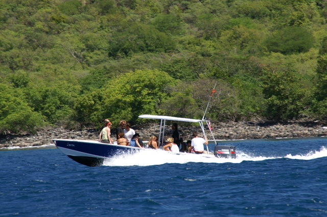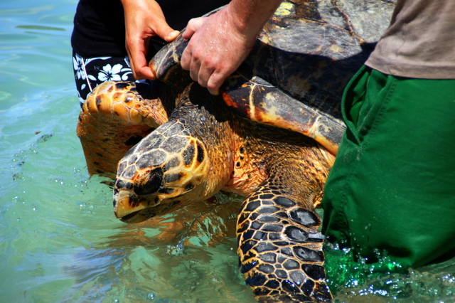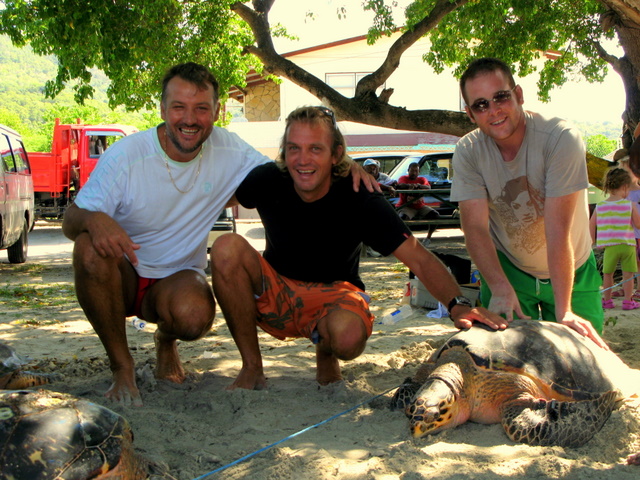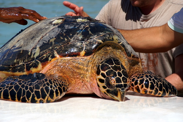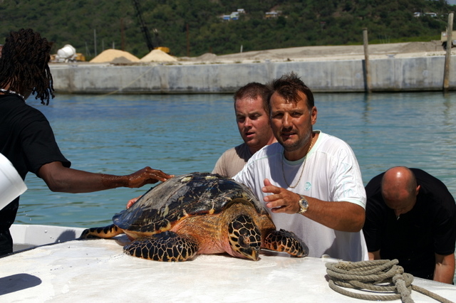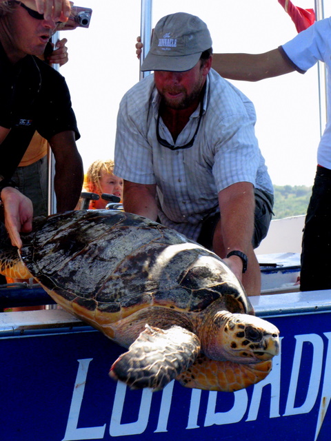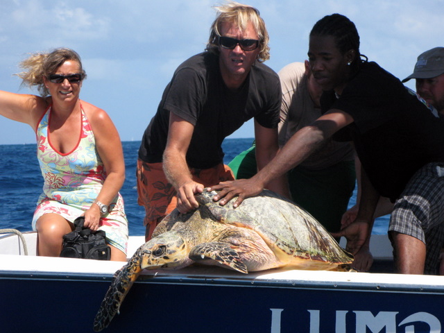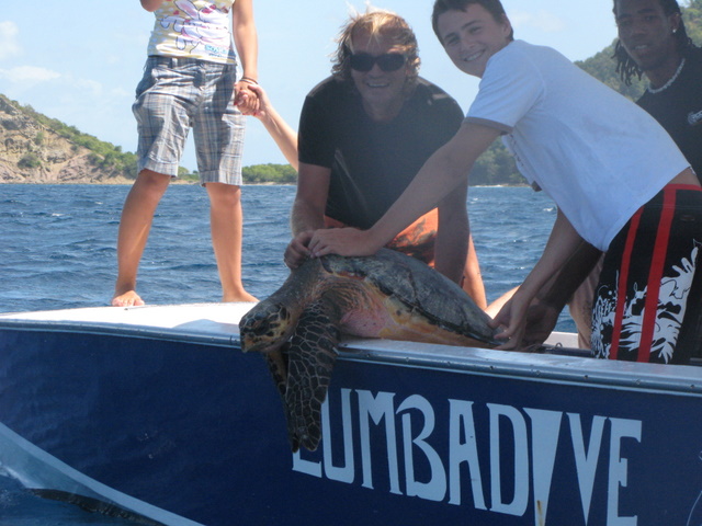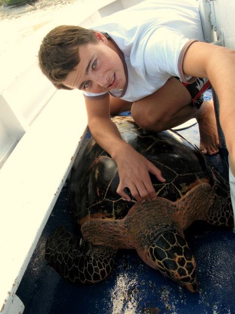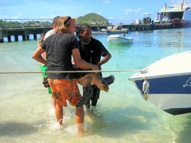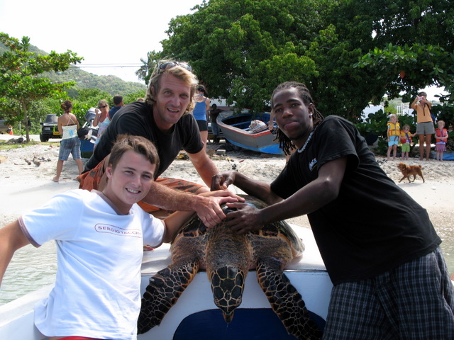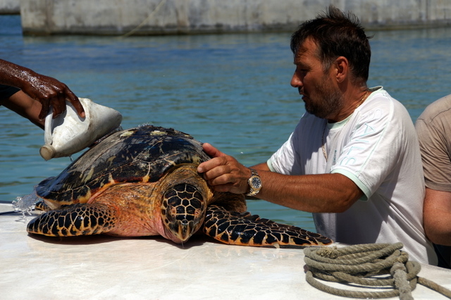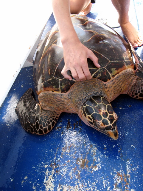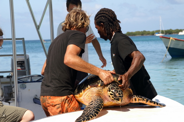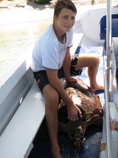 Ce matin JP est passé nous chercher sur notre bateau pour la remise à l'eau de tortues imbriquées.